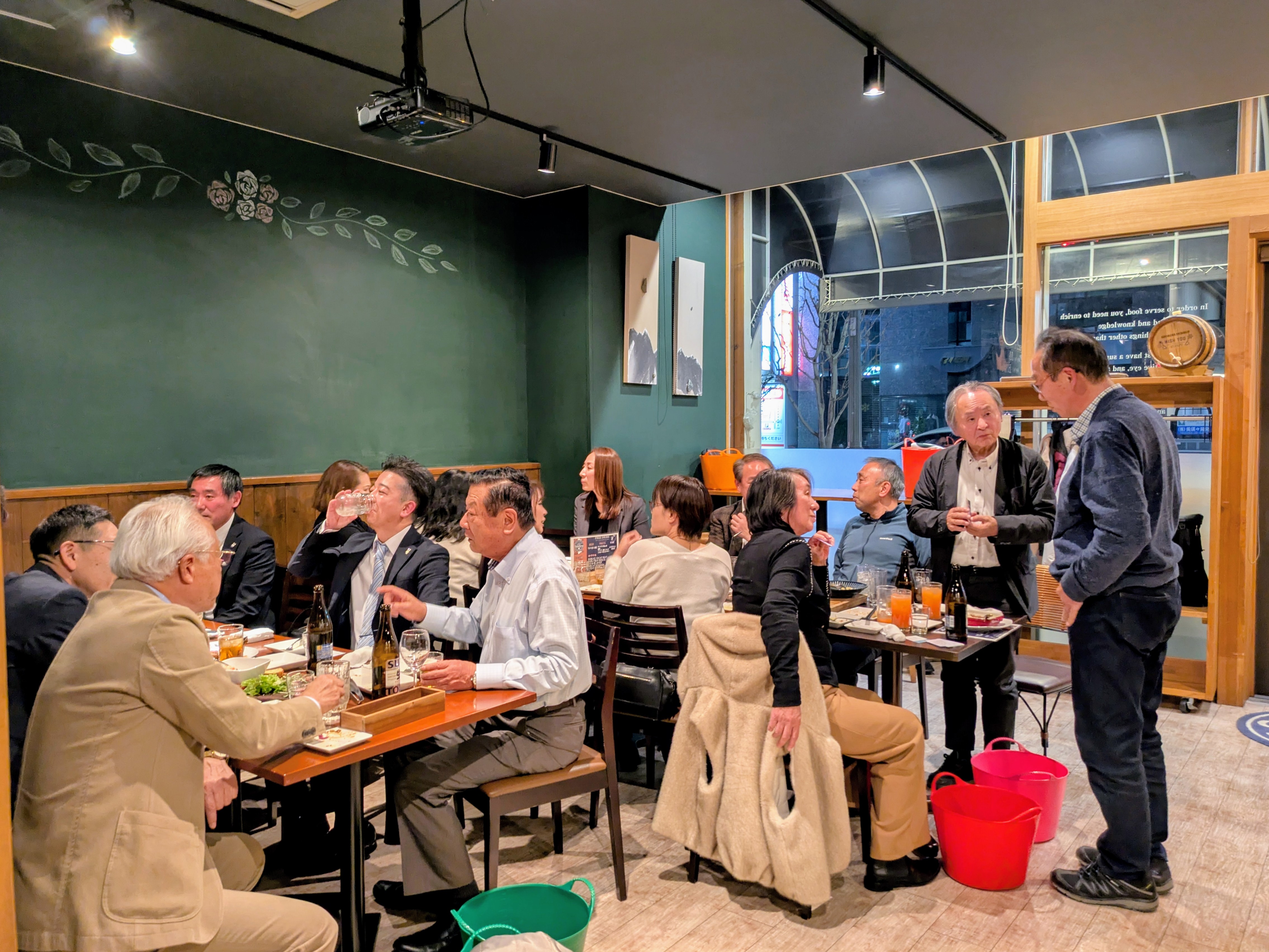(1)の会員&先輩会員合わせて18名の会員が、杯を交わしお肉料理を楽しみつつ情報交換をし、知識もお腹もいっぱいになりました。